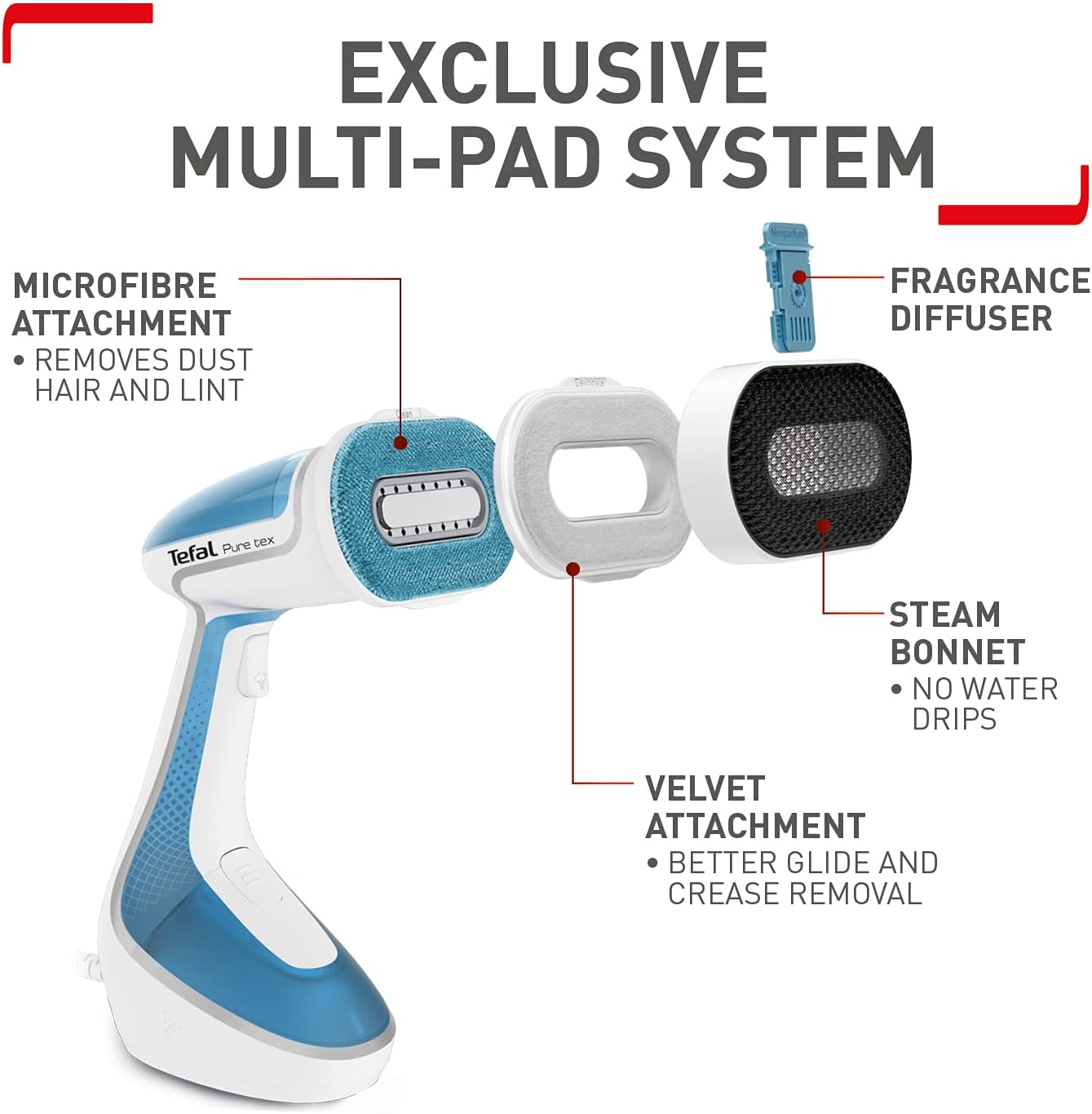 • Multi-task Exclusive new magnetic multi-pad system enables you to easily sanitise, removes creases, de-lint, de-hair, freshen and add fragrance. Heat-up time 25 Seconds